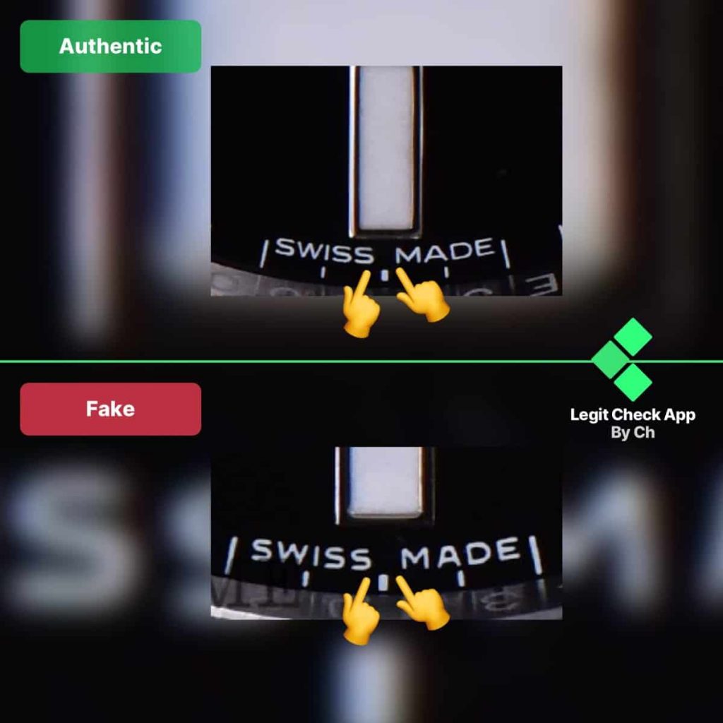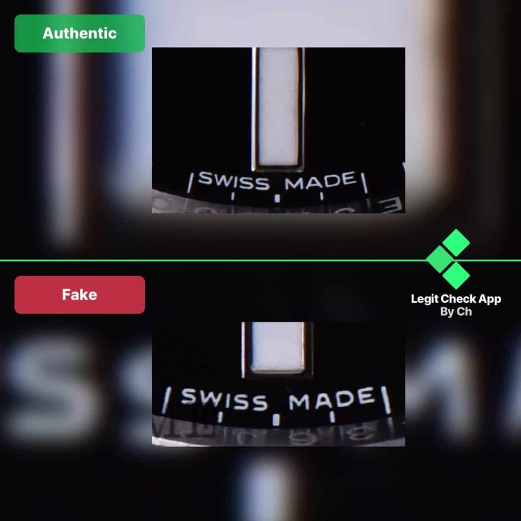 With the “SWISS” text being placed too close to the 30 minutes tick, you can see how the “MADE” text on the fake vs real Rolex Submariner is placed too far away from the tick.